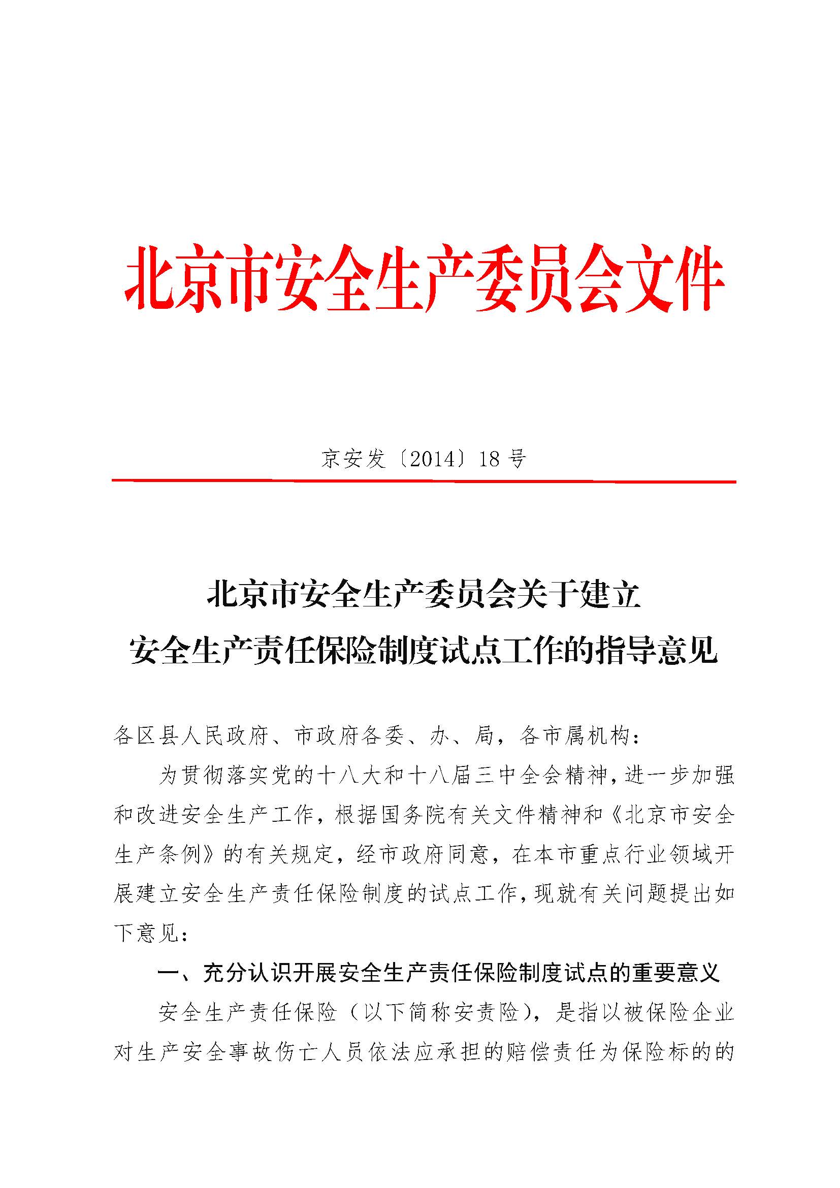 北京市安全生产委员会关于建立安全生产责任保险制度试点工作的指导意见.doc