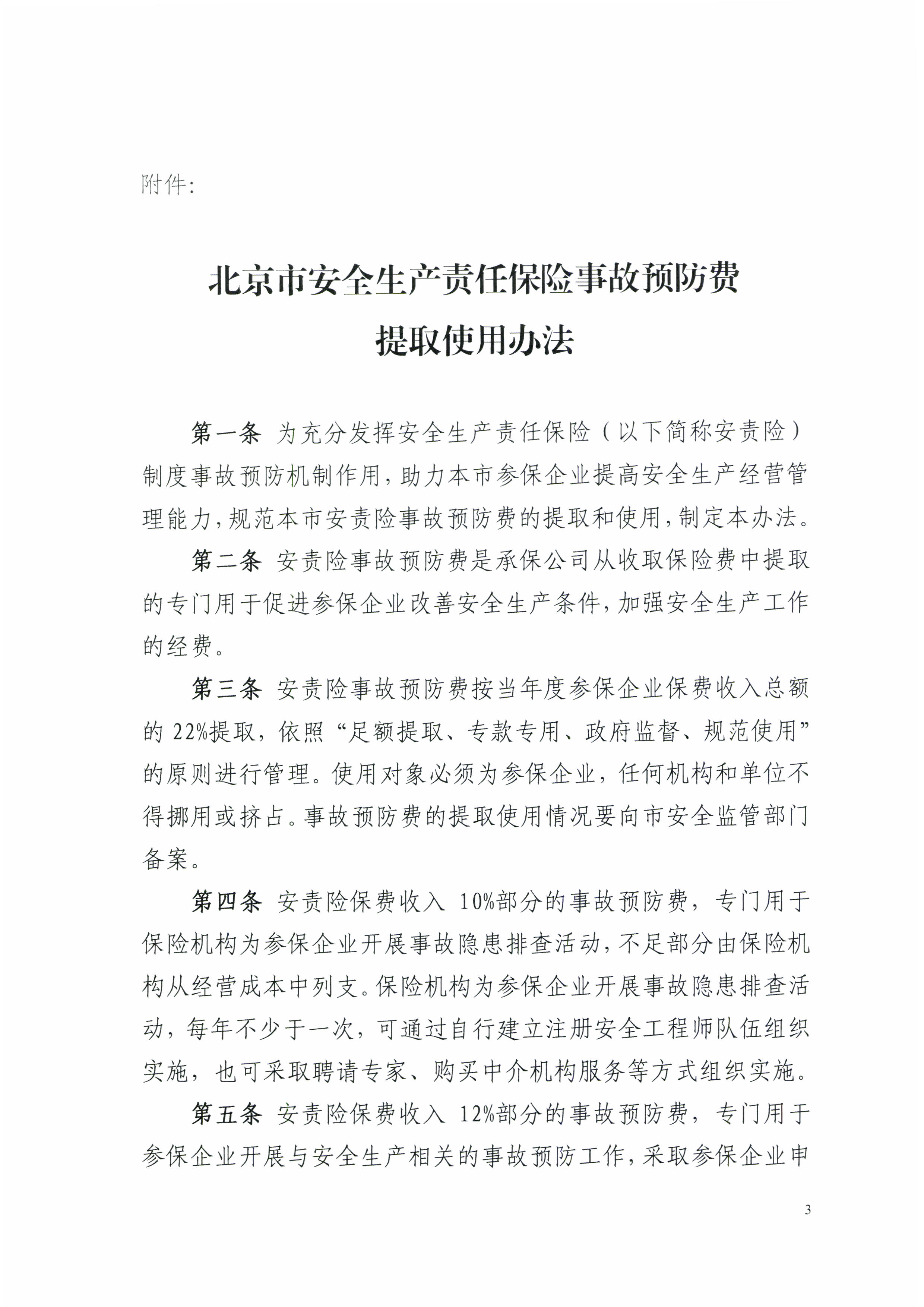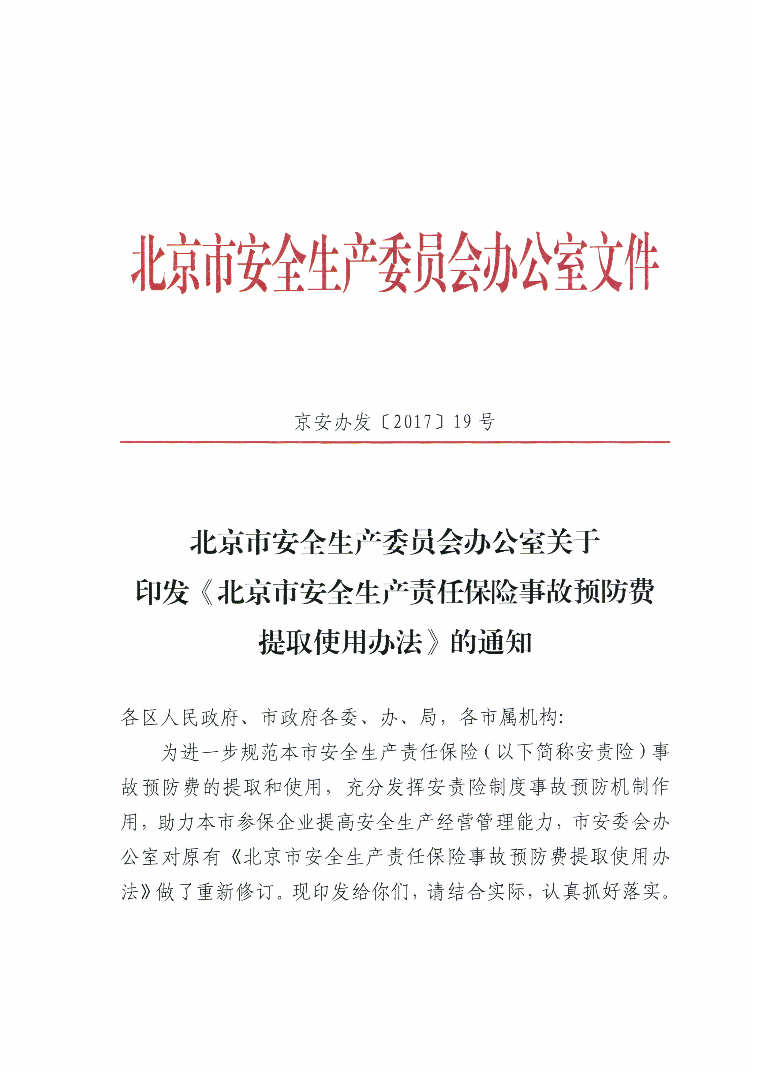北京市安全生产委员会办公室关于印发《北京市安全生产责任保险事故预防费提取使用办法》的通知
