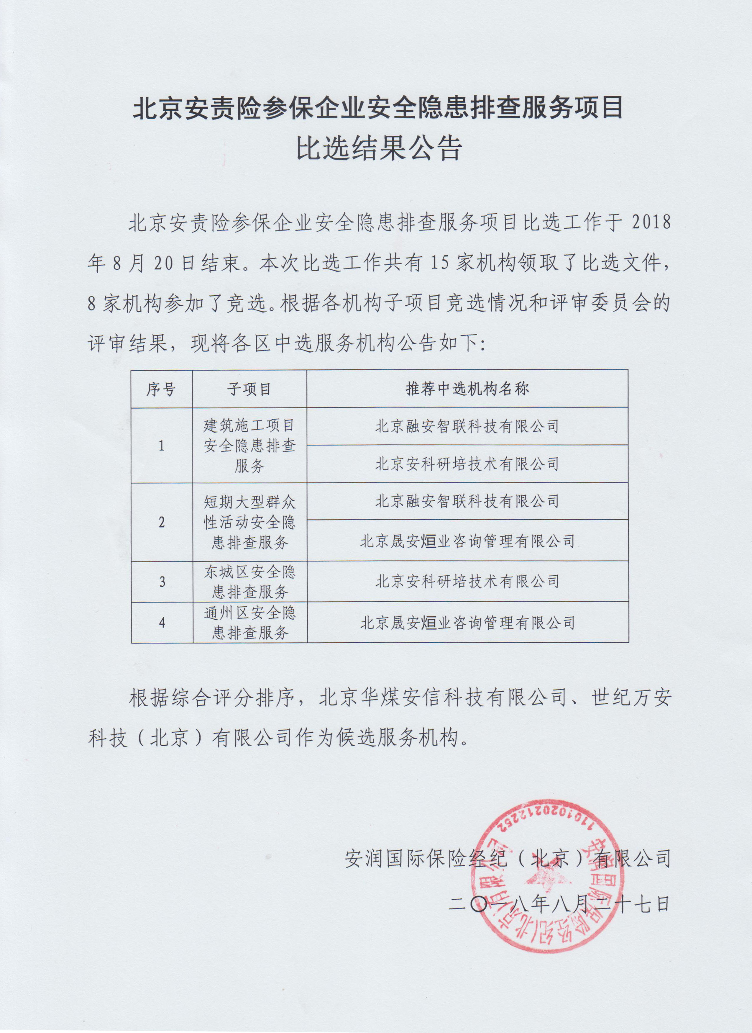 安责险参保企业安全隐患排查服务项目比选结果公告